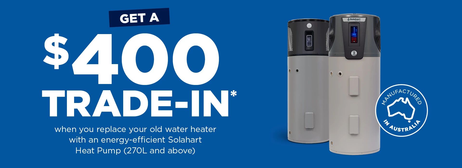 And right now, get a $400 trade-in* when you replace your old water heater with a Solahart Heat Pump (270L and above).
